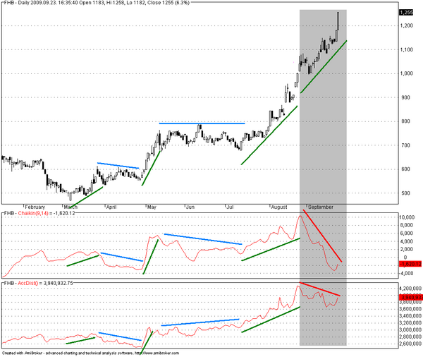 Bearish divergenciát mutatnak a forgalom alakulását mérő indikátorok (Chaikin Oscillator, Accumulation Distribution):