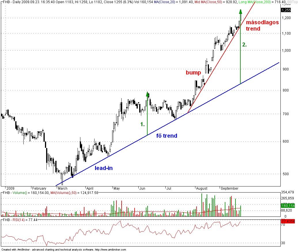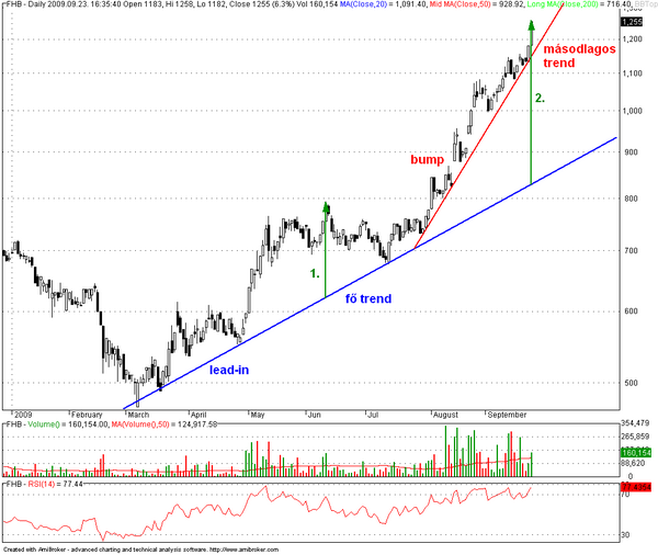 A harmadik grafikonon látható alakzatot (bump & run) csak ma kreáltam, miután lezártam a pozíciómat. Lehet, hogy csak önigazolást keresek? Ki tudja… Mindenesetre az alakzat szabályai úgy tűnik teljesültek eddig. (fő trendvonal, másodlagos trendvonal ~50%-al meredekebb, forgalom alakulása: bump szakasz első felében fokozott érdeklődés, majd csökkenés). Azonban ez még csak az alakzat fele, s egyáltalán nem derül ki belőle, hogy tovább fog-e emelkedni a részvény árfolyama.